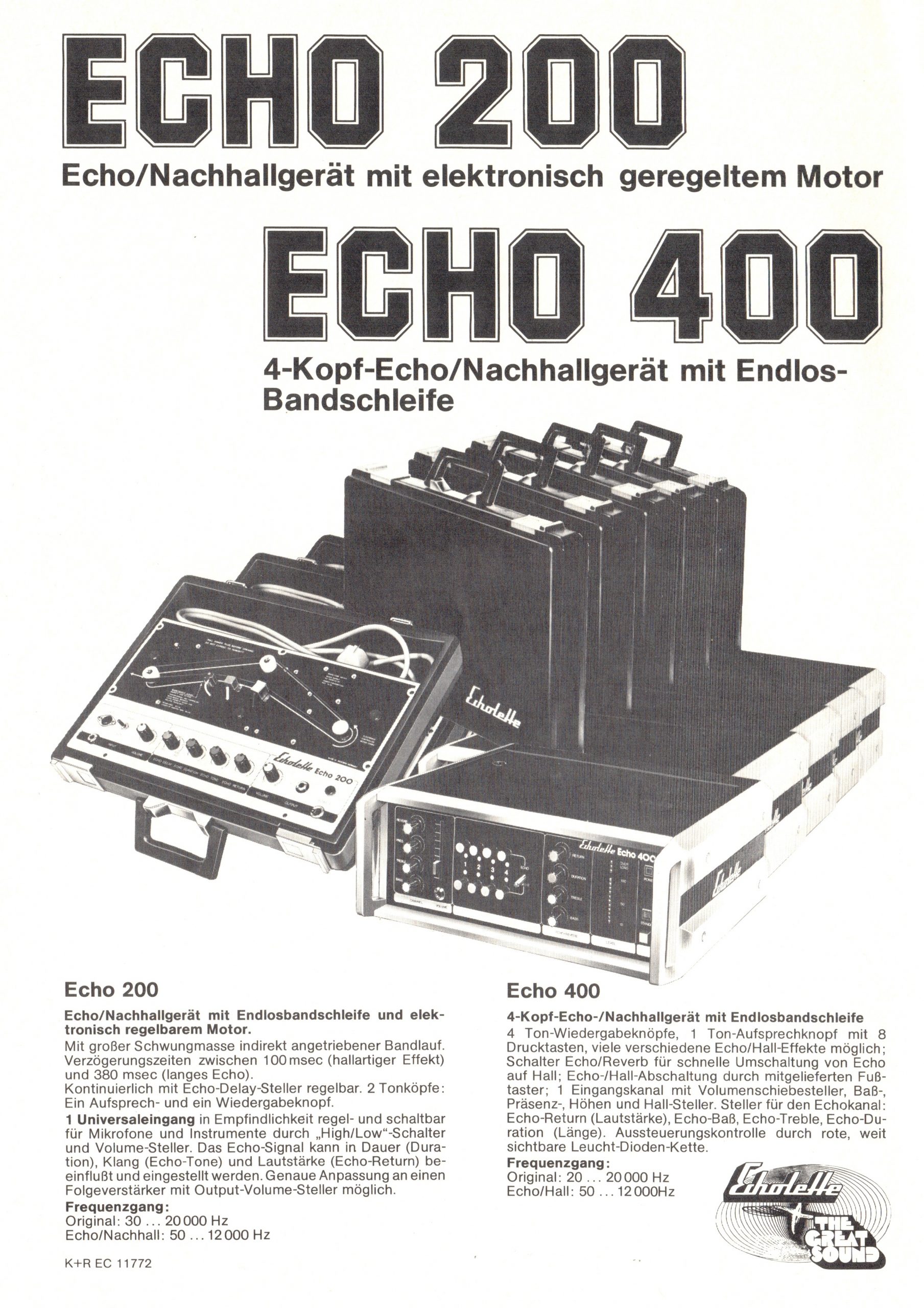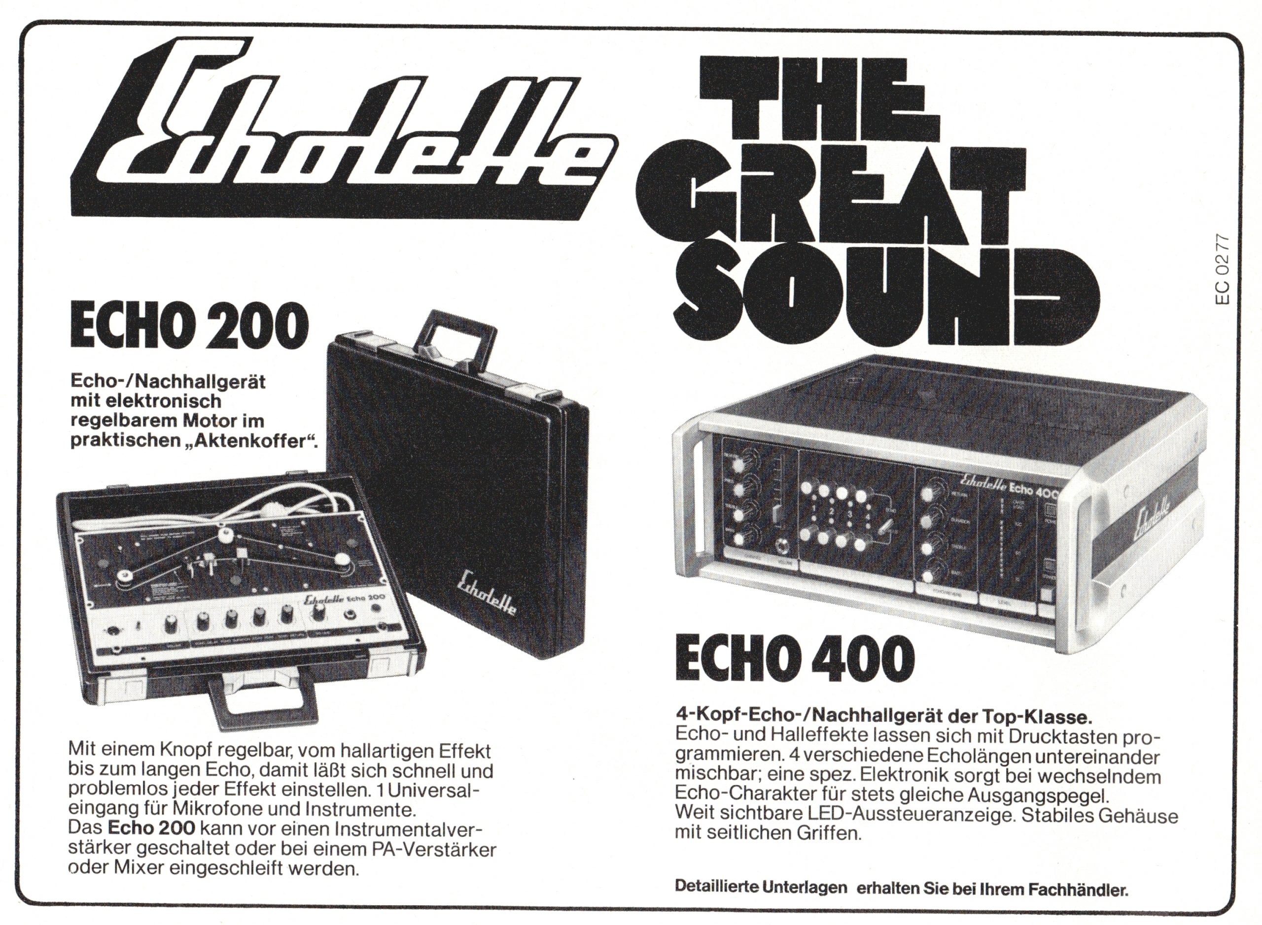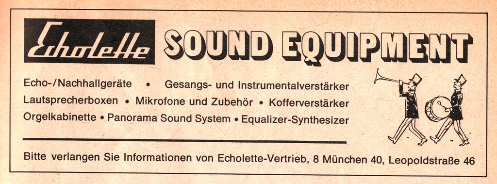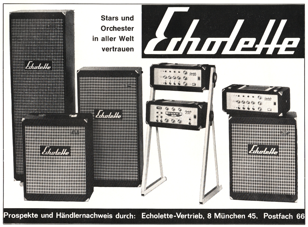 Bassverstärker B40N oben rechts (mit Lautsprecherbox ET1). Ein Modell, von dem es heute nur noch selten ein Exemplar zu sehen gibt. Die männlichen Werbegesichter dieses Jahres sind – wie die Damen in der Werbung zuvor – feste Größen Nachkriegsdeutschlands: Vor allem das Hazy Osterwald Sextett („Kriminal-Tango“), das man in den ersten Jahren von Echolette-Vertrieb sehr oft in den Anzeigen sieht und auch Max Greger (unten rechts).
