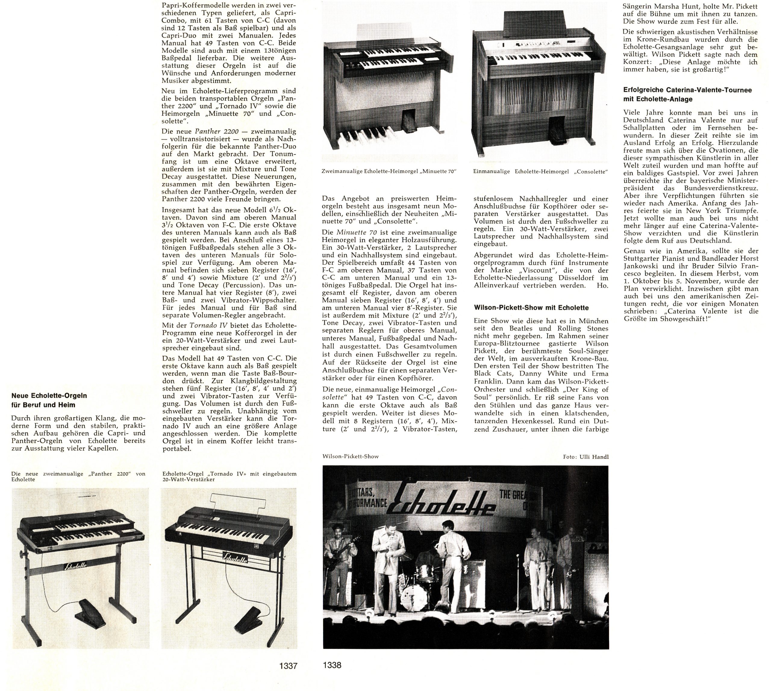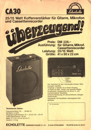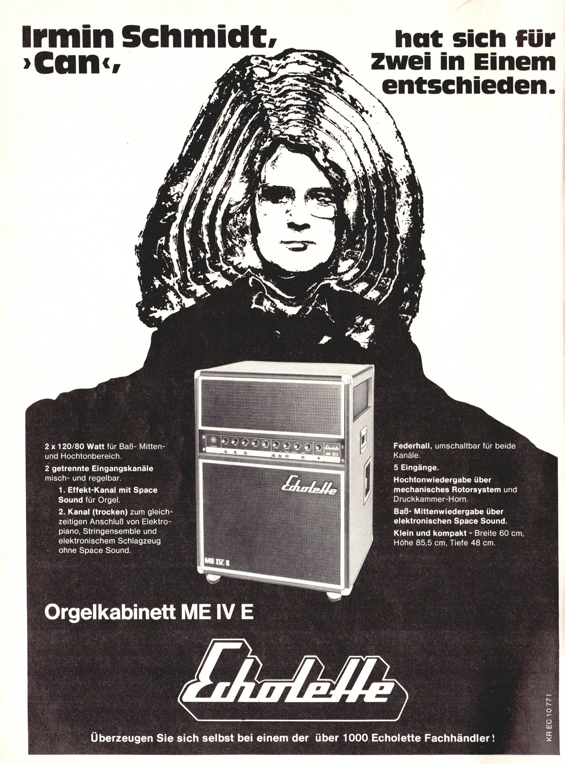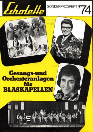 Bassverstärker B40N oben rechts (mit Lautsprecherbox ET1). Ein Modell, von dem es heute nur noch selten ein Exemplar zu sehen gibt. Die männlichen Werbegesichter dieses Jahres sind – wie die Damen in der Werbung zuvor – feste Größen Nachkriegsdeutschlands: Vor allem das Hazy Osterwald Sextett („Kriminal-Tango“), das man in den ersten Jahren von Echolette-Vertrieb sehr oft in den Anzeigen sieht und auch Max Greger (unten rechts).