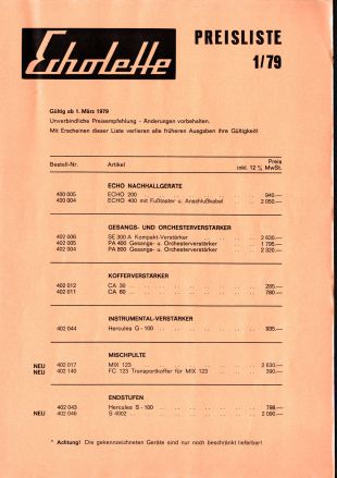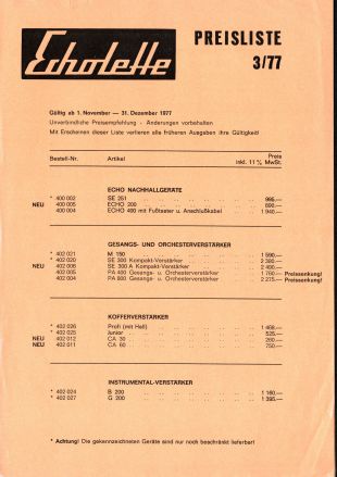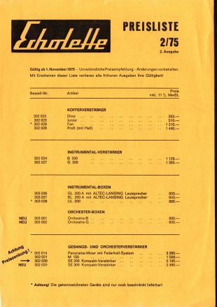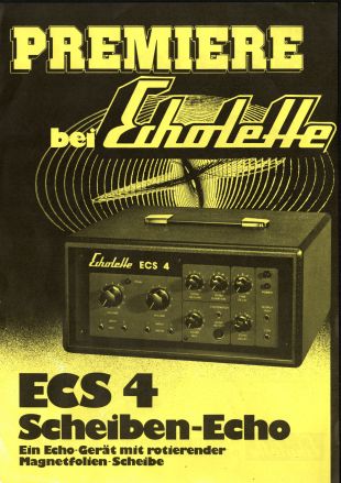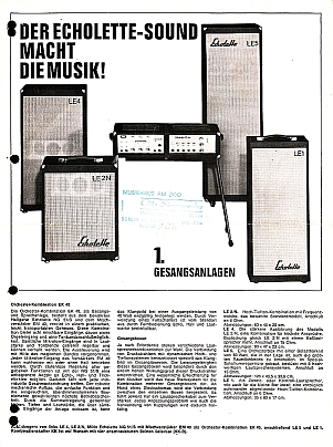 Echolette Werbung aus dem Showbusiness Magazin Ende 1961. Man sieht hier beinahe das damalige Gesamtprogramm, bestehend aus: M40, NG-51 S, NG-41, dem passenden Transportkoffer für Verstärker und Bandecho, der Gitarren-Kombo G40 (unten links), dem Mikrofon ED-12, sowie den Lautsprecherboxen LE-2 und LE-1 (groß)