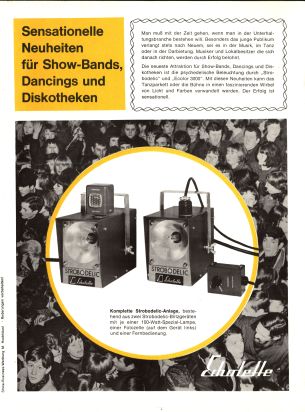 Im Dezember 1963 wird der sagenhafte Echolette Showstar S40 erstmals im Showbusiness Kundenmagazin von Echolette Vertrieb beworben. Hier zu sehen mit der Lautsprecherbox ET2 (40 Watt, Isophon-Bestückung). Mit der ET4 stand zeitgleich auch eine 80 Watt Box zur Verfügung. Dies war notwendig, da der Verstärker nominelle 70 Watt Musikleistung hat. Weil Isophon hier keine passenden Lautsprecher im Sortiment hatte, ist der ET4 mit JBL Boxen bestückt.